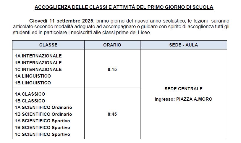 Gli Studenti saranno accolti nell’atrio della sede centrale dalla D.S. e dallo Staff della D.S., dopo l’appello e il saluto di benvenuto, saranno affidati ai Docenti in orario.