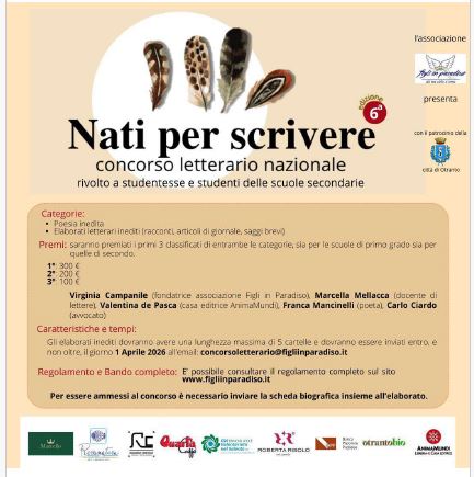 Il Concorso “Nati per scrivere 2026”, promosso dall’Associazione OdV Figli in Paradiso – Ali tra cielo e terra, è rivolto esclusivamente ai giovani talenti della scrittura che, in tutta Italia, frequentano le Scuole Secondarie di primo e secondo grado. Le opere saranno valutate secondo i seguenti criteri: correttezza grammaticale e lessicale, qualità dello stile, intensità emotiva e originalità del contenuto. 12 premi in denaro vengono assegnati a giovani scrittori delle scuole superiori di primo grado (dal primo al terzo classificato per la prosa, dal primo al terzo classificato per la poesia) e delle scuole superiori di secondo grado, sempre divisi tra prosa e poesia.