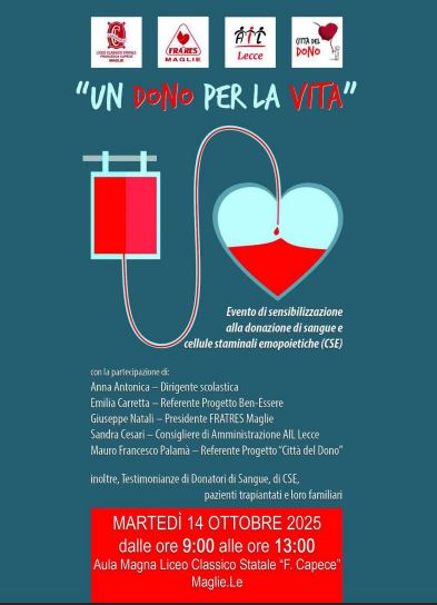 Si comunica che martedì 14 ottobre 2025 le classi quinte, parteciperanno all’incontro, in Aula Magna, “UN DONO PER LA VITA”.