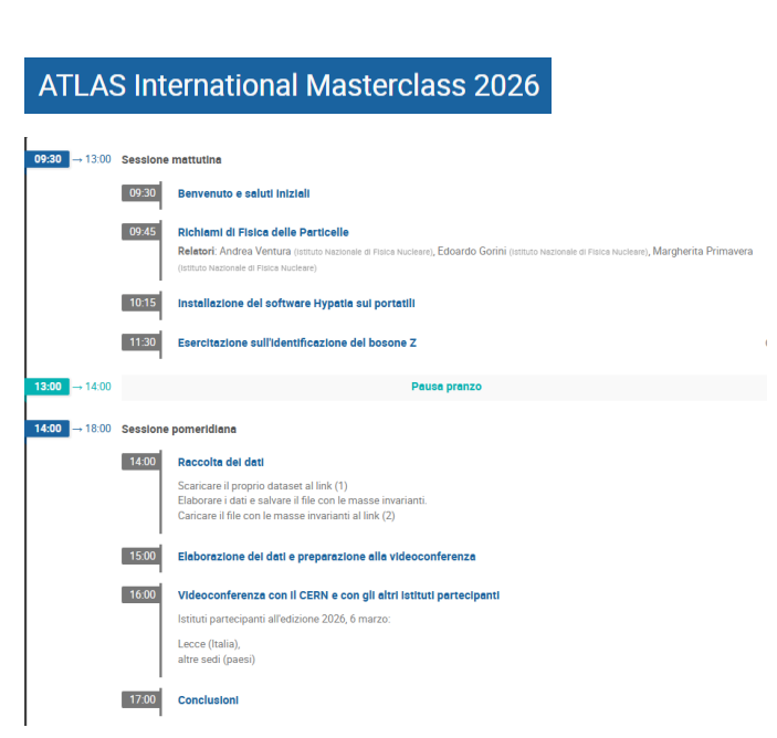 Durante l’incontro si svolgeranno esercitazioni basate sui dati reali raccolti dall’Esperimento ATLAS al CERN di Ginevra e una videoconferenza finale con il CERN e con le altre sedi partecipanti.