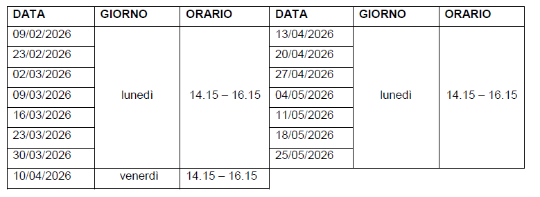 Il corso sarà tenuto dalla prof.ssa Emilia Carretta con il tutor prof. Fantastico Eufemia e avrà inizio lunedì 9 febbraio 2026, dalle ore 14.15 alle ore 16.15, nell’Aula Magna secondo il seguente calendario: