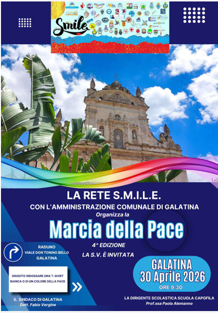 Si comunica che in data 30 aprile 2026 le classi in indirizzo parteciperanno alla 4^ Edizione della “Marcia della Pace”, organizzata dalla rete SMILE che si terrà a Galatina. Il percorso della marcia attraverserà i luoghi simbolici di Galatina, come il centro storico e le aree di interesse culturale. Saranno presenti rappresentanti delle scuole della rete SMILE, insieme a partners esterni che condividono gli ideali dell’iniziativa. Inoltre, saranno previsti momenti di riflessione e attività educative lungo il precorso. La partenza è prevista per le ore 8:05 dal Megaparcheggio ed il rientro per le ore 13:15. Gli studenti saranno accompagnati dalle docenti, Prof.sse Emilia Carretta e Regina Sabato, a cui consegneranno l’autorizzazione presente nel libretto dei permessi (tagliando giallo), debitamente compilata e firmata.
