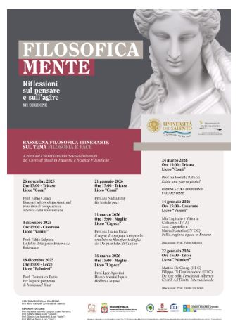 Parte il progetto dedicato alla “RASSEGNA ITINERANTE FILOSOFICA-MENTE” organizzato dal Dipartimento di Studi Umanistici dell’Università del Salento. Il tema di quest’anno è “FILOSOFIA DELLA PACE”, in considerazione delle tematiche internazionali di questo periodo.